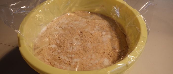 その後、ビニールで覆い中蓋と重石を置きホコリや虫が入らないようにビニールで全体を覆います。