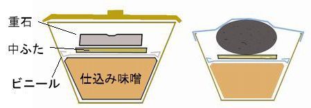 味噌を樽底に叩きつけ空気を抜きながら漬け込んで下さい。